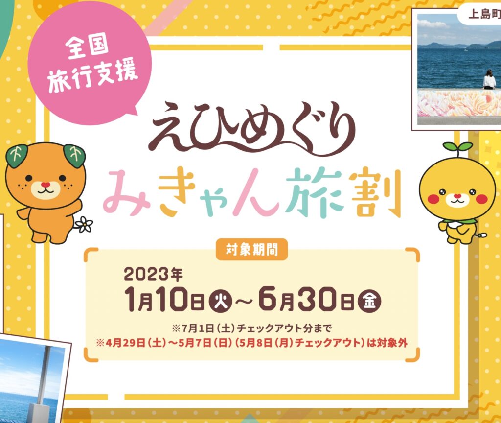 愛媛県は、県内の宿泊・交通付き宿泊・日帰り旅行代金の一部を補助する全国旅行支援(全国旅行割)キャンペーンを実施。
