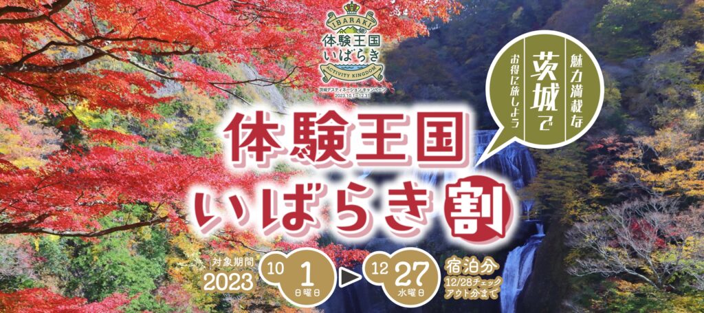 茨城県では、新型コロナウイルス感染症により落ち込んだ茨城県内の観光需要の喚起を促すため、全国民を対象に旅行割引を通じて支援する「体験王国いばらき割」を実施。