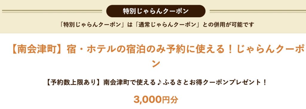 全国旅行支援と併用する場合、南会津町の割引クーポンを獲得後に宿検索し「全国旅行支援対象」ラベルが付いた宿を予約すれば、併用できます。