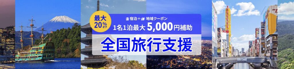 全国旅行支援は、国内の旅行代金を20%割引され、旅行先の都道府県の飲食店や土産店などで使える地域クーポン券が平日2,000円分・休日1,000円分配布されるキャンペーンです。