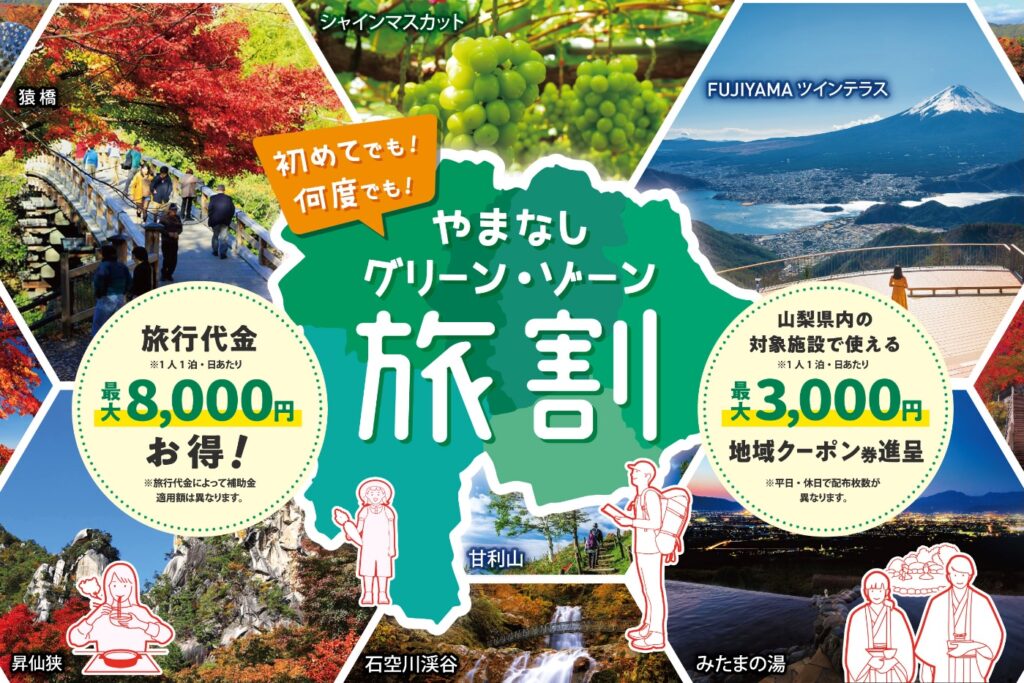 やまなしグリーン・ゾーン旅割は、宿泊・交通付宿泊・日帰り旅行に対する旅行割引に加え、土産品店・飲食店・観光施設などで使える地域クーポン券を進呈し、観光需要を喚起するキャンペーンです。